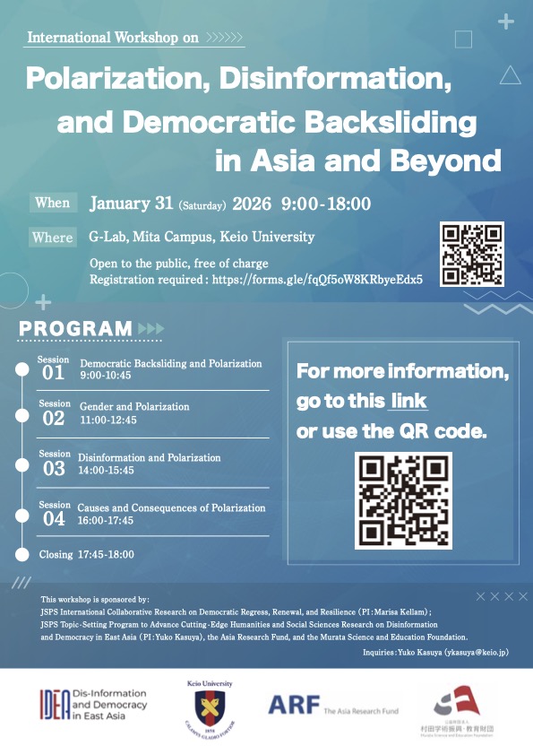 2026年1月31日(土)に慶應義塾大学三田キャンパスにおいてワークショップ「Polarization, Disinformation, and Democratic Backsliding in Asia and Beyond」を開催します。